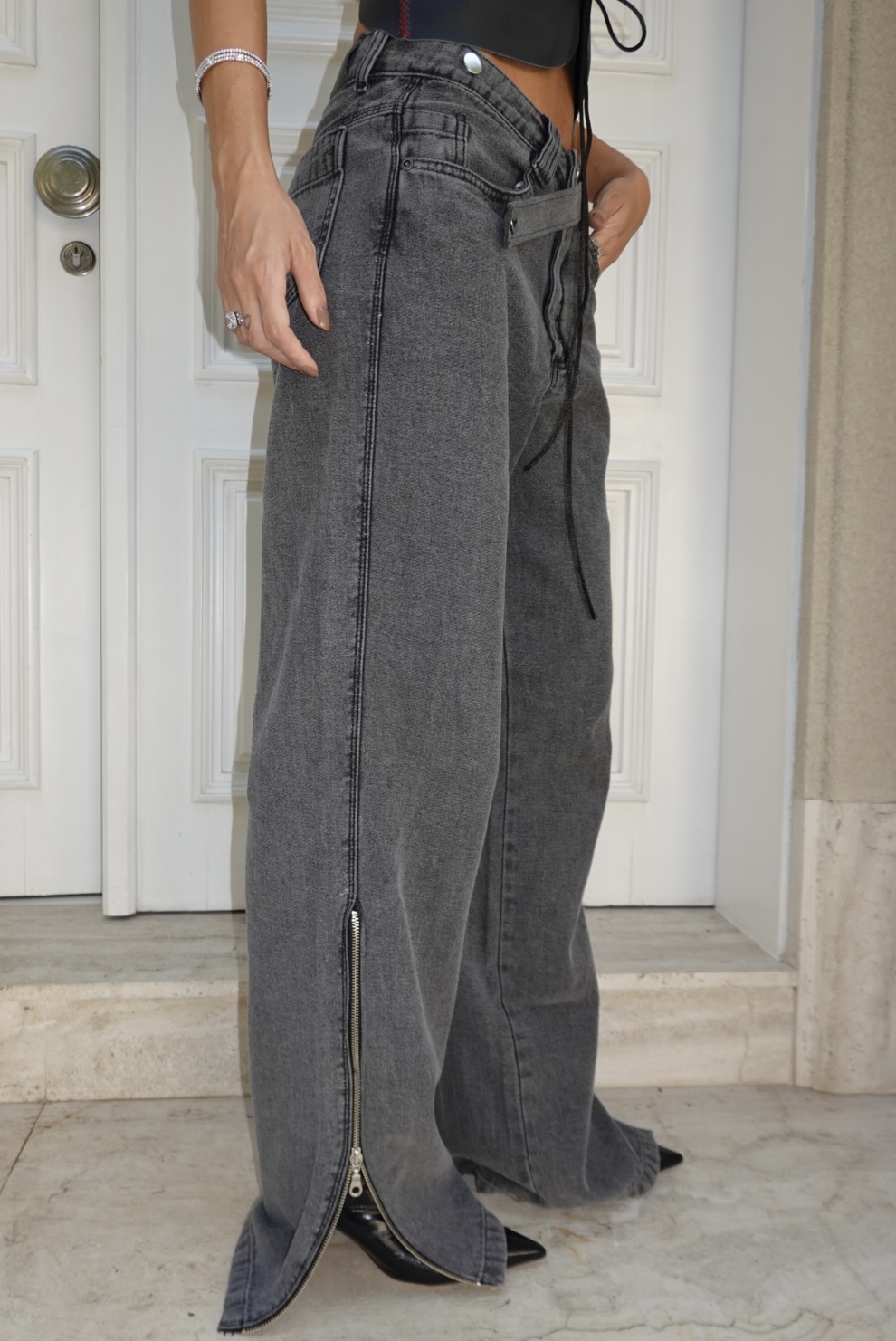 Calça jeans em denim premium em lavagem grafite, moderna e sofisticada! A peça traz recortes estruturais. Cós transpassado, fechamento frontal e modelagem reta ampla! O destaque fica por conta das aberturas laterais com zíper metálico, que percorrem a barra e permitem diferentes formas de uso.